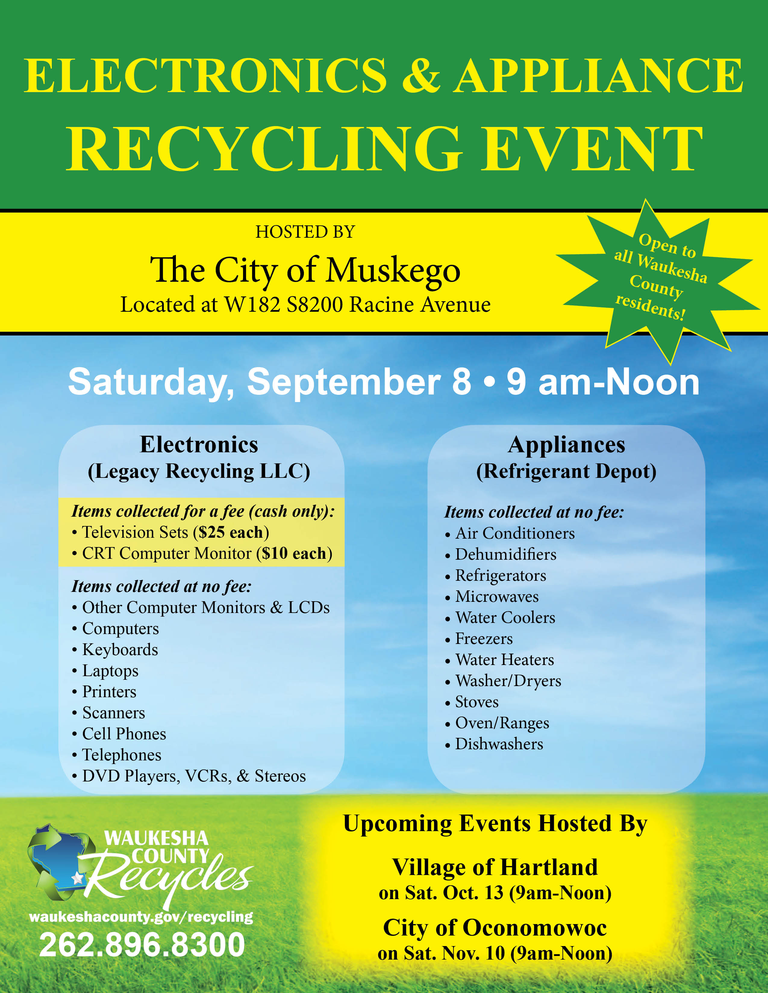 (WAUKESHA, WI) – The City of Muskego will be hosting a special one-day collection of household electronics and appliances open to any Waukesha County resident on Saturday, September 8 from 9:00 a.m. to noon. The collection will take place at W182 S8200 Racine Ave.