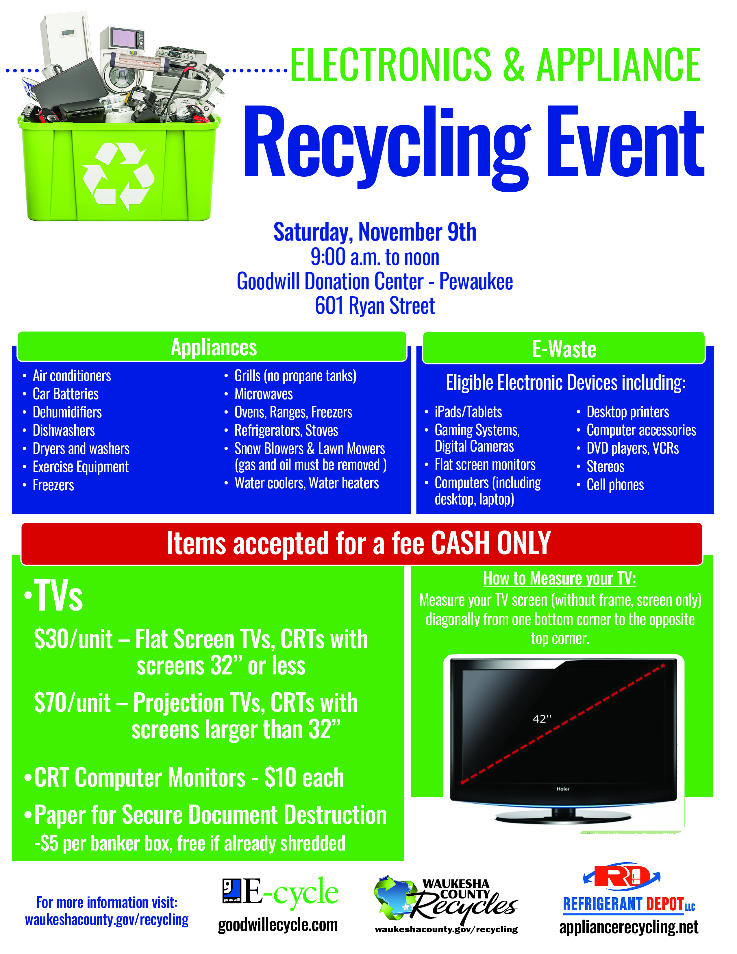(WAUKESHA, WI) –A special one-day collection of household electronics and appliances open to any Waukesha County resident will be held on Saturday, November 9 from 9:00 a.m. to noon. The collection will take place at the Goodwill Donation Center located at 601 Ryan Street in Pewaukee.
